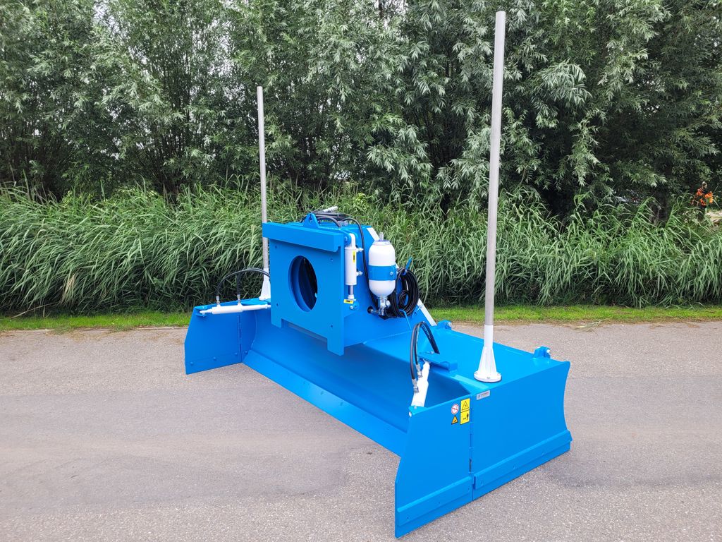 This version features a round dozer blade which is used for moving and spreading heaps of sand and soil. The leveller is also equipped with hydraulic doors and a manually adjustable bottom plate. When the Hardox blades on the sides wear down, the bottom plate can be adjusted. This leads to a much larger lifespan of the hardox blades before they need replacing.