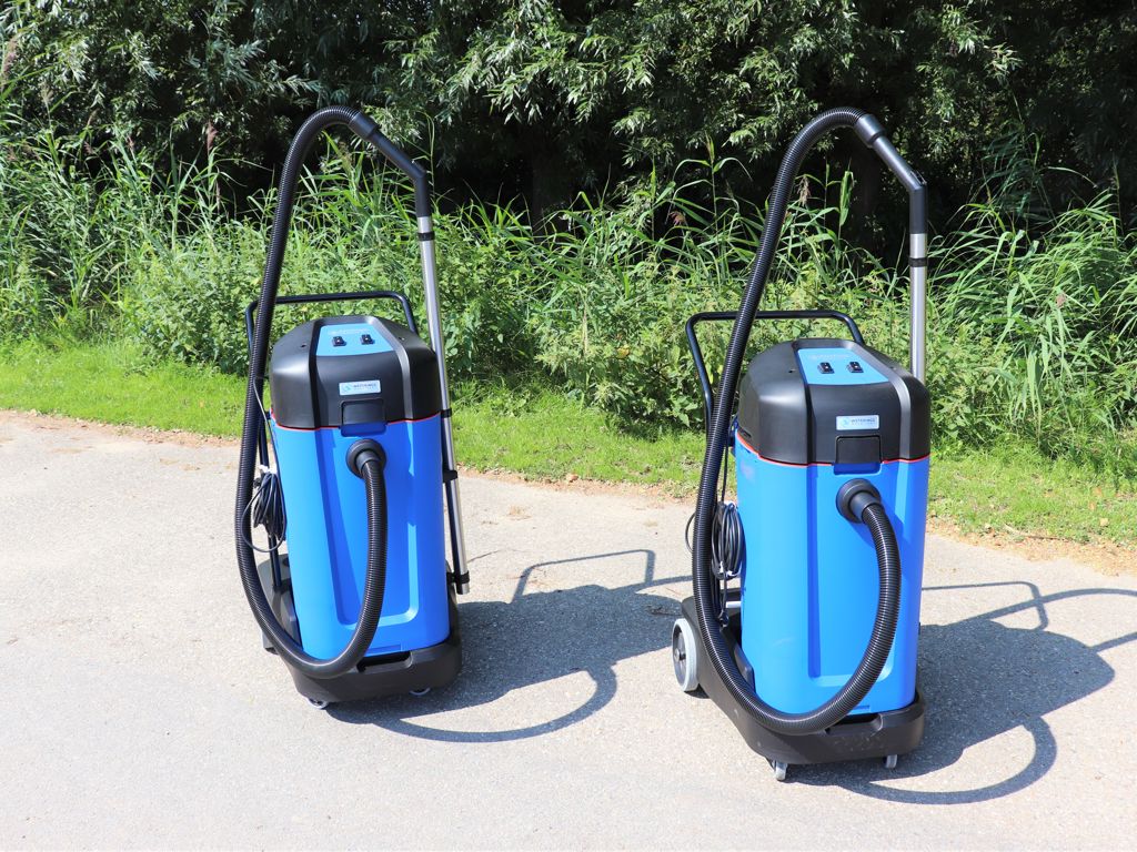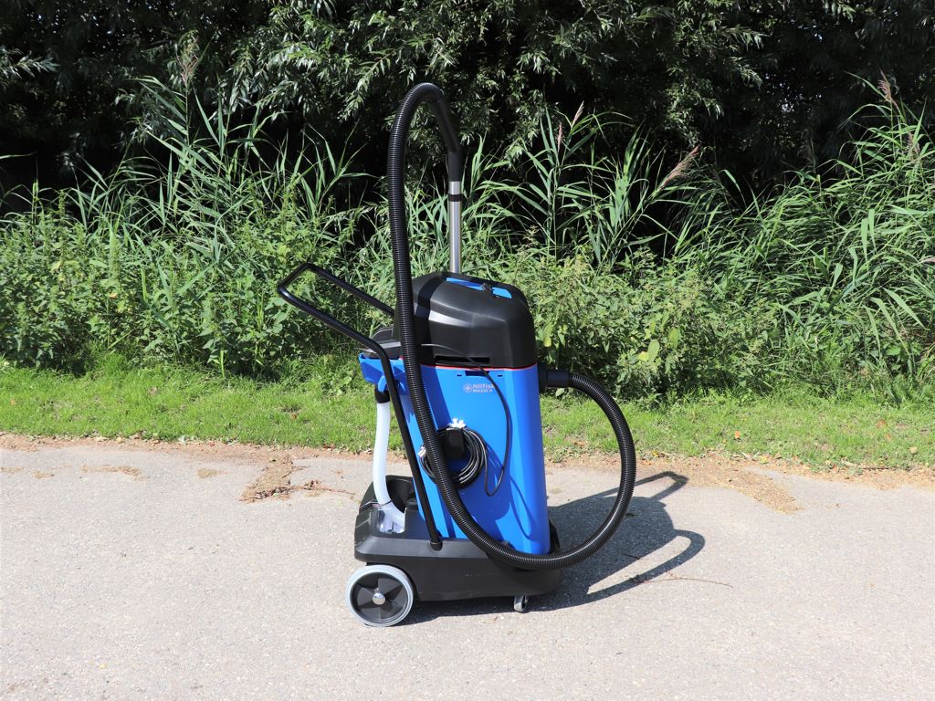 Dual filter system to handle different substances without human intervention Easy emptying (with motor head fitted) Stainless steel tube Intuitive single handed locking mechanisms Wet mesh sack filter protecting the motor from foam ingress Flexible and handy mounting of tools and accessories Fixed steel push handle Standard tipping mechanism Transparent drain hose for indication of water level in the container The containers can be easily lifted off the trolley for cleaning or maintenance When tipping, the container pivots on the steel push handle