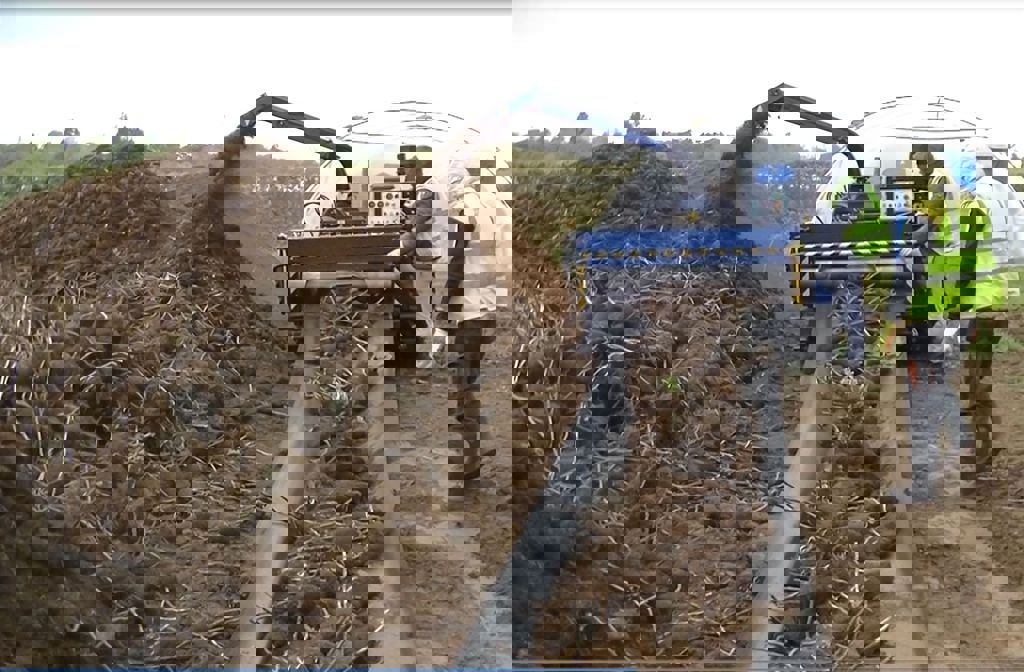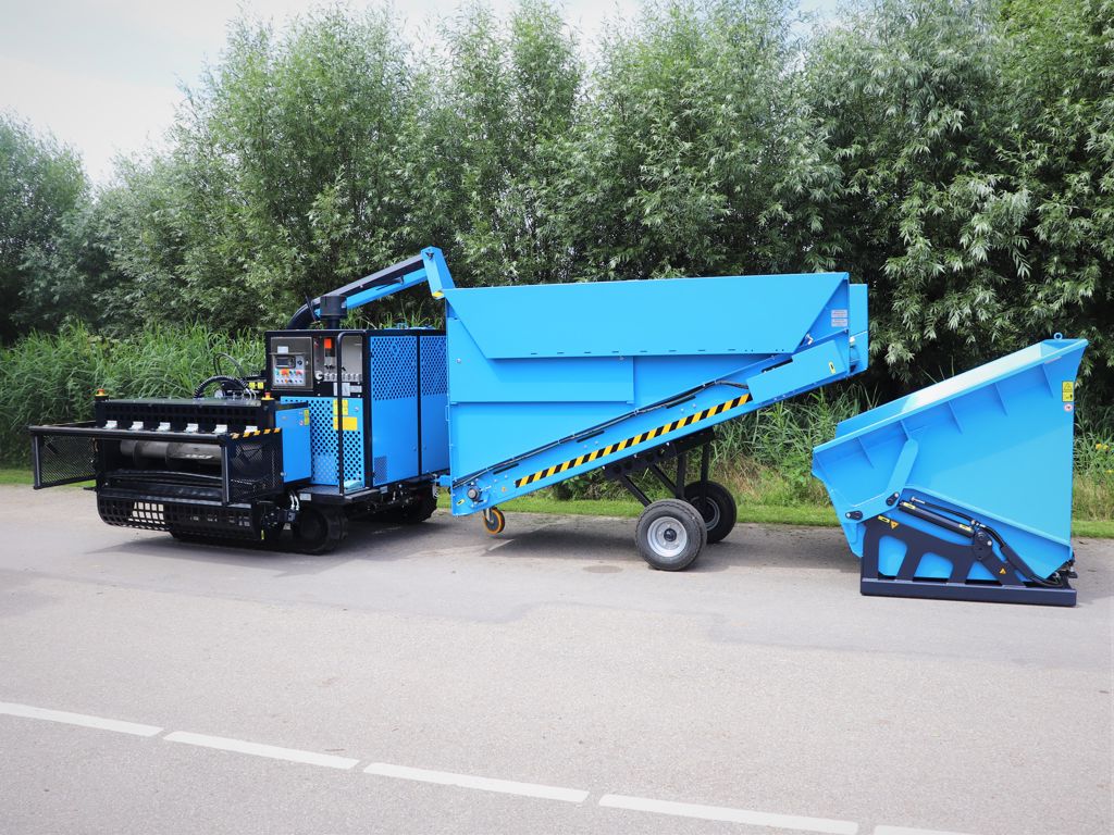 De machine werkt met transportmatten, waarop het gewas wordt gestreken. De transportmat wordt opgerold, waardoor het gewas naar de machine wordt getransporteerd, ingevoerd en versnipperd. Het versnipperde gewas wordt middels een uitwerpbuis in een kantelcontainer gestort, welke middels een heftruck geleegd kan worden