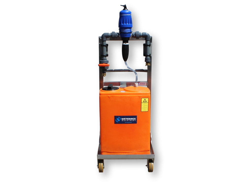 Deze doseerunit wordt o.a. ingezet voor het reinigen en desinfecteren van deense karren, veilingkarren, of vrachtwagens in plantenkwekerijen. De doseerunit is uitgerust met een D3RE5BPVF Dosatron. De unit is volledig uit RVS opgebouwd, voorzien van een 60 liter PE tank en PU bok- en zwenkwielen.