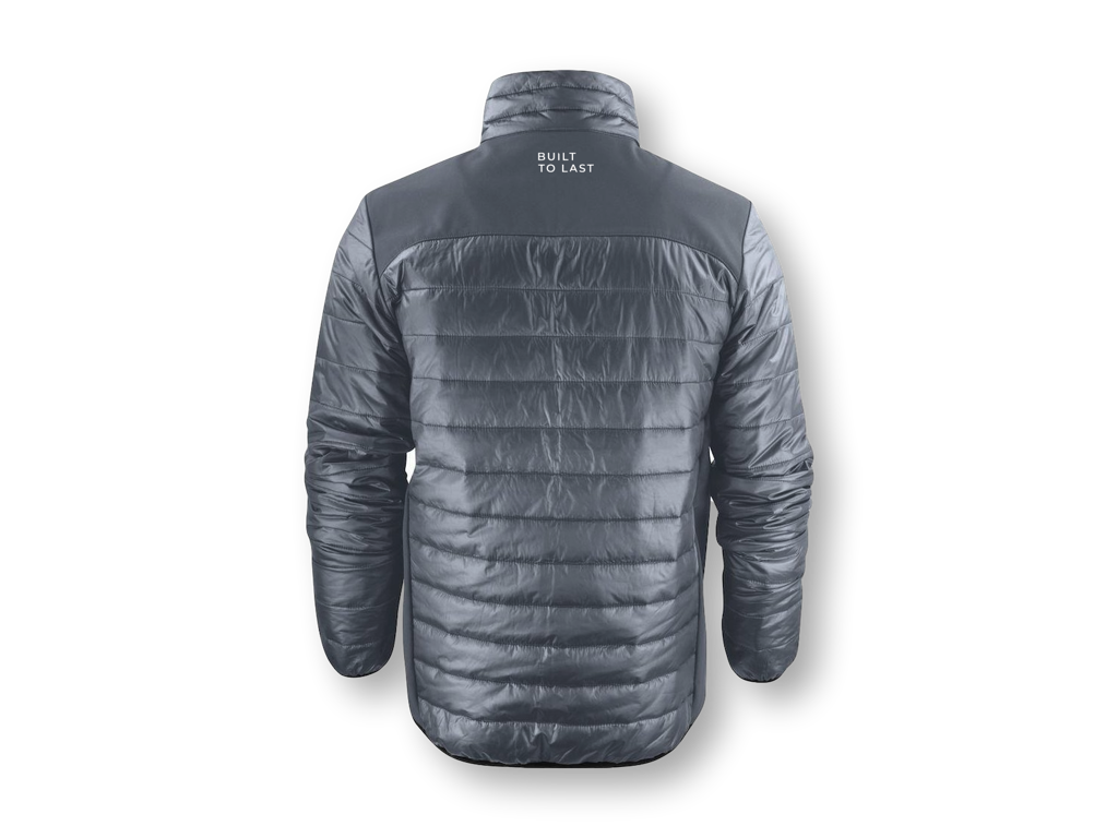 Lichte jas in twee materialen: juk en zijpanelen in softshell en body (voor-en achterkant) en mouwen in een ander lichtgewateerd materiaal. Trekkoord onderaan de zoom. Tweekleurige ritssluiting en zippullers in contrasterende kleur.