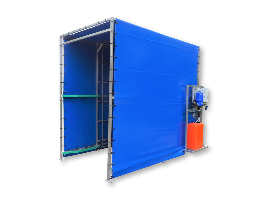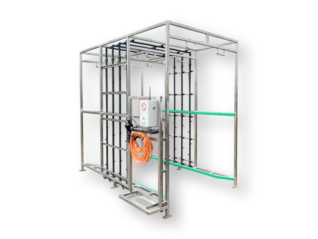 Deze karren ontsmetter verzorgt een complete dekking van onsmettingsmiddel op stapelkarren. De ontsmettingstunnel is voorzien van een arsenaal van sproeiers, waarmee alle hoeken en gaten van de karren worden geraakt. Dankzij de breedstraal nozzles zijn zelfs opstaande kantplanken geen belemmering voor een complete dekking.