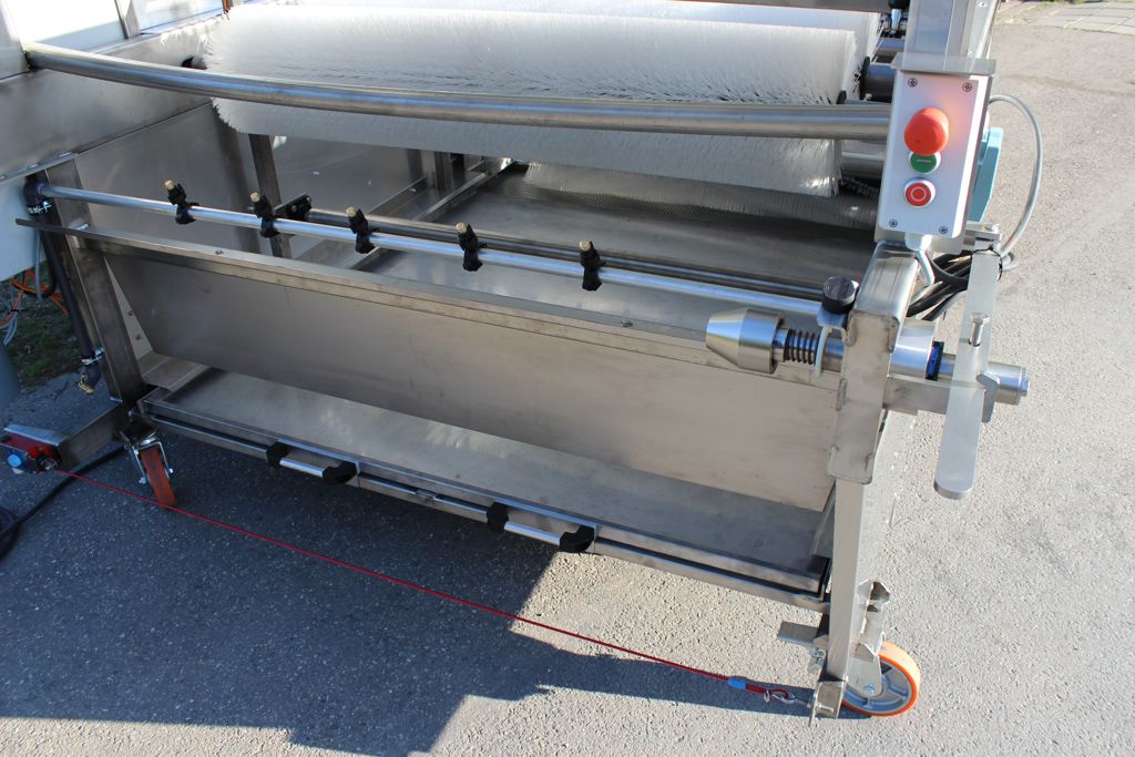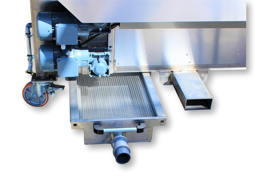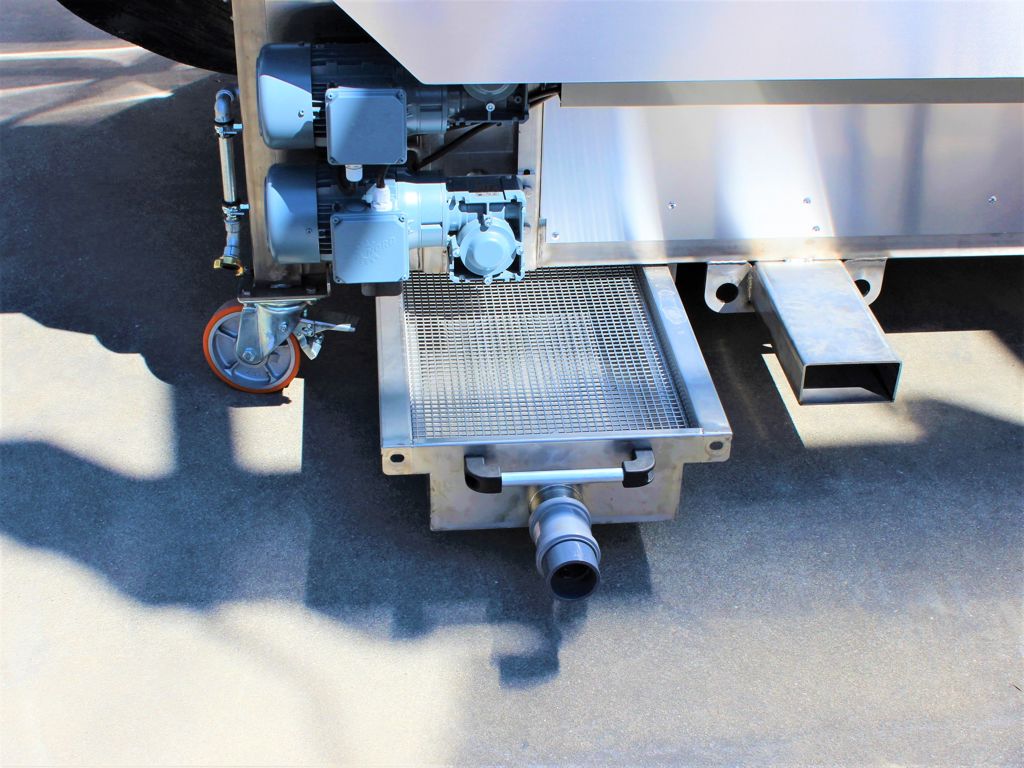 Deze opvangbak zorgt ervoor dat het vuile water wordt opgevangen en middels een afvoerslang naar een gewenste locatie kan worden geleid. De bak sluit de gehele onderzijde van de machine af. het vuile water wordt verzameld in een uitschuifbare opvangbak welke voorzien is van een grofvuilrooster. De opvangbak is voorzien van een Afsluiter met Geka aansluiting, waarmee de bak doorgespoeld worden.